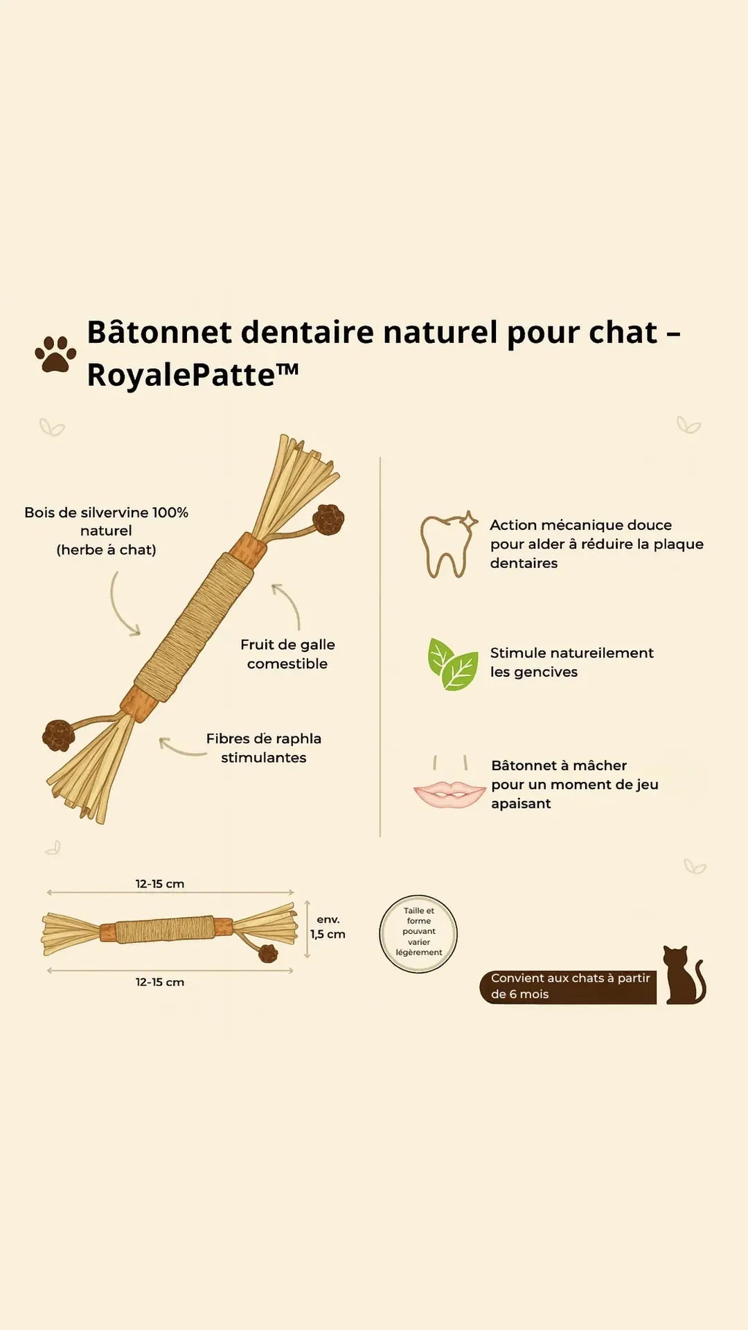 Les bâtonnets dentaires pour chat RoyalePatte™ sont conçus pour aider à maintenir une bonne hygiène bucco-dentaire tout en offrant un vrai moment de jeu.